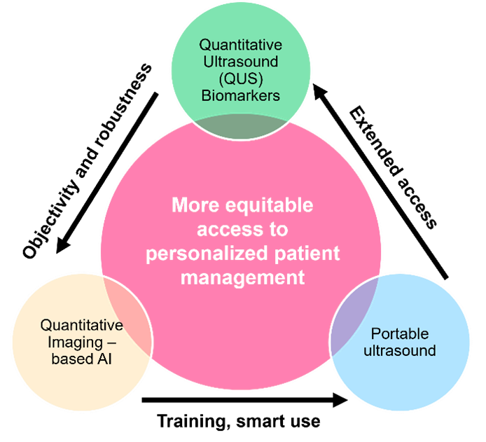 To achieve our mission, we rely on a strategy focused on developing ultrasound imaging methods that provide quantitative biomarkers. A quantitative imaging biomarker is a feature extracted from in vivo medical image data that quantifies the health(?) of the tissue or can be used for monitoring its changes through a disease process or response to a treatment.