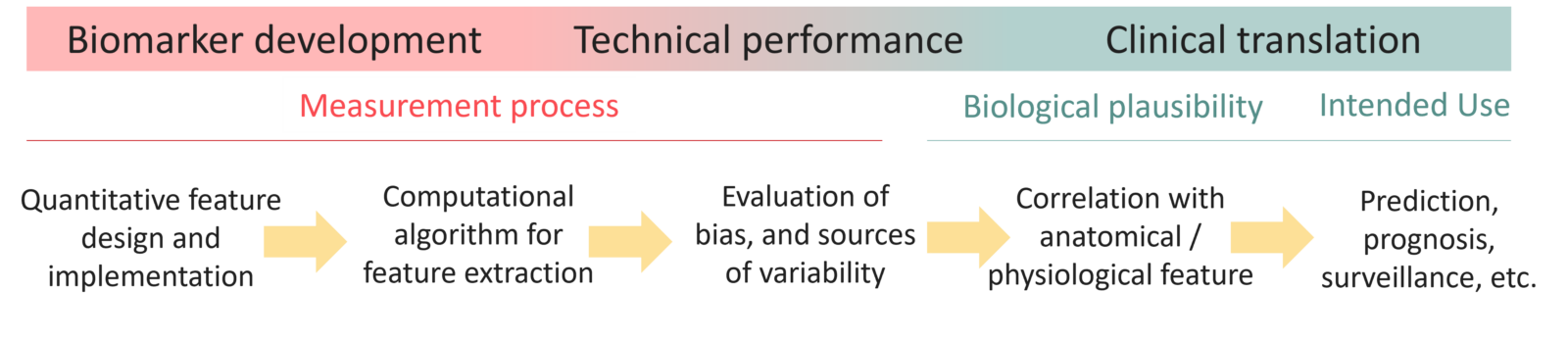 This strategy starts by developing the physical and engineering basis for biomarker quantification, followed by the evaluation of the technical performance (assessment of bias and sources of variability). Then, we test the clinical performance of the biomarkers, i.e., the correlation with the structural or functional characteristic of tissue, as well as its performance for a specific task, like diagnosis, prognosis, surveillance, etc.